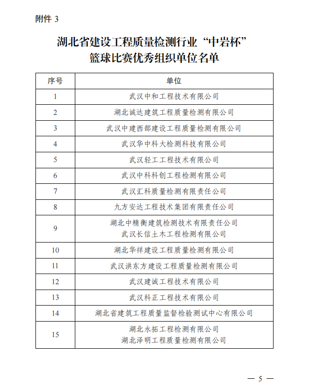 此次籃球比賽豐富了我省建設(shè)工程質(zhì)量檢測行業(yè)的員工生活,培養(yǎng)了檢測人“頑強拼搏、奮勇爭先”的體育競技精神,賽出了水平,賽出了風(fēng)尚,賽出了友誼,加強了同行之間的交流、促進了合作,為共同推動湖北省建設(shè)工程質(zhì)量檢測行業(yè)的高質(zhì)量發(fā)展作出了貢獻。